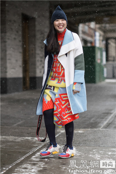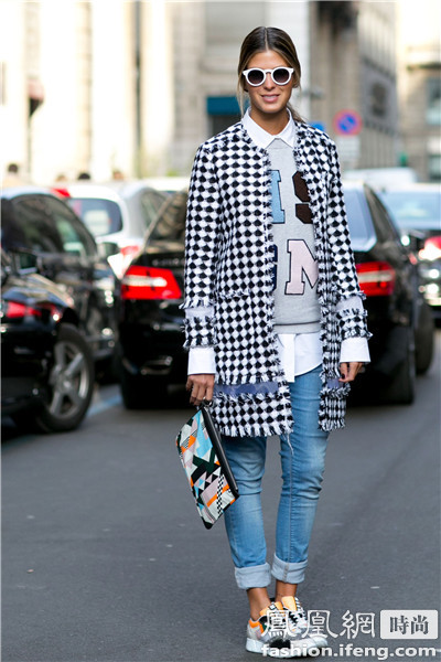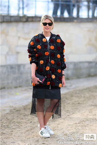 Kabuki 艺术总监Elina Halimi 花色的外套用白色运动鞋来搭配整套装扮素雅得体