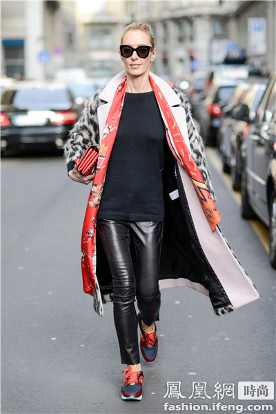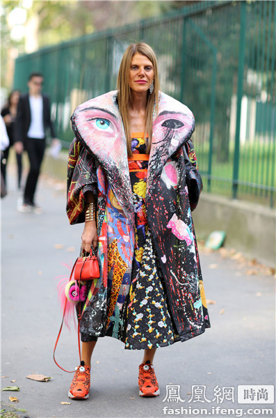 日本版《Vogue》创意总监Anna Dello Russo穿印花大衣配橘色运动鞋出街