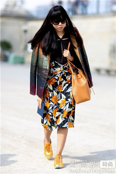时尚博主Blogger Susie Lau Susie Bubble橙色的运动鞋与裙子上的花色相互呼应