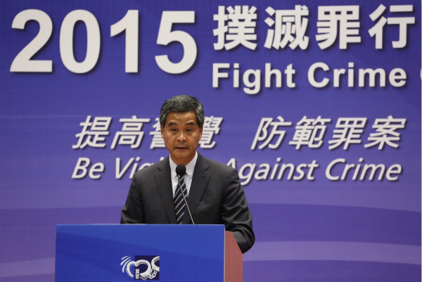 3月21日,香港特区行政长官梁振英在政府总部出席2015年扑灭罪行联席会议,并在会议上致辞。香港中通社