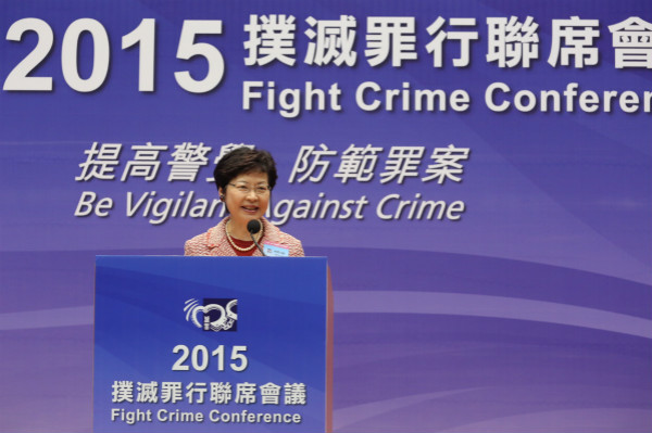 3月21日,香港特区政府政务司司长林郑月娥在政府总部出席2015年扑灭罪行联席会议,并在会议上致辞。香港中通社