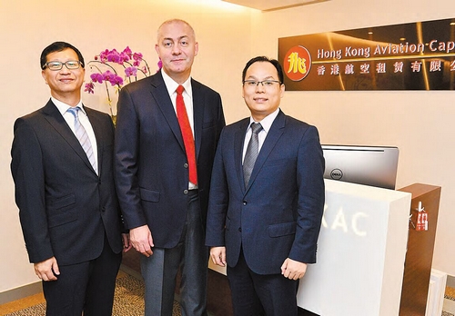 海航集团(国际)首席运营官崔家兴(左),香港航空租赁(HKAC)行政总裁博唐纳、行政副总裁及财务总监莫凯翔(右)接受本报记者专访。