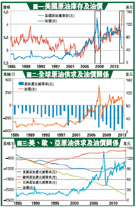 是否供過於求容後討論,但話說回來,難道現時只以美國原油庫存大增就可把油價弱勢定調?回看圖一,自1985年以來,原油庫存數量的多寡不時與油價同向,當中於2001至2007年及2009至去年都曾見過同升情況。而說到兩者背馳,則有近半年來油價大跌及2008年的金融海嘯。由此可見,庫存大增就可炒低油價?似乎未必一定。換句話講,庫存數據與油價升跌並無明顯關係。另外,現時坊間都因而推斷原油供過於求,但庫存增加究竟是反應供應增加還是需求減弱呢?這就無從稽考。供應或正因油企危機而增加,但需求有否減弱似乎需要其他數據佐證。