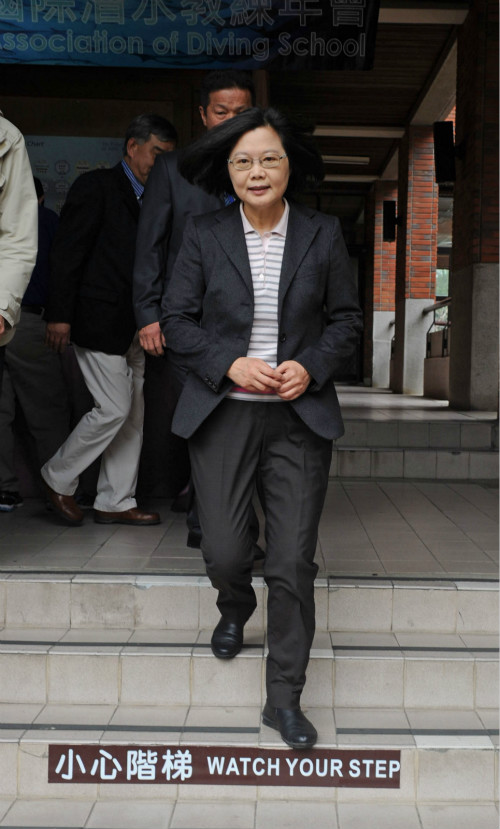 民进党主席蔡英文(前)22日表示,希望在复杂国际情势下,维持两岸和平稳定的同时,也能守住台湾最大利益