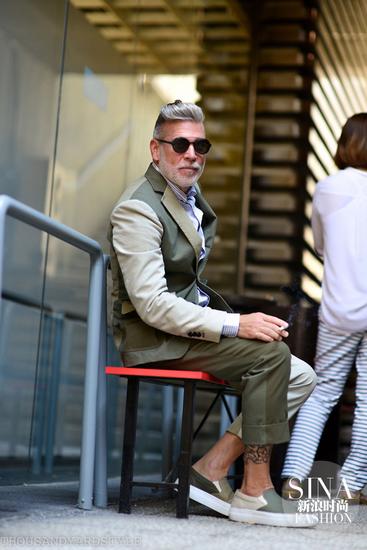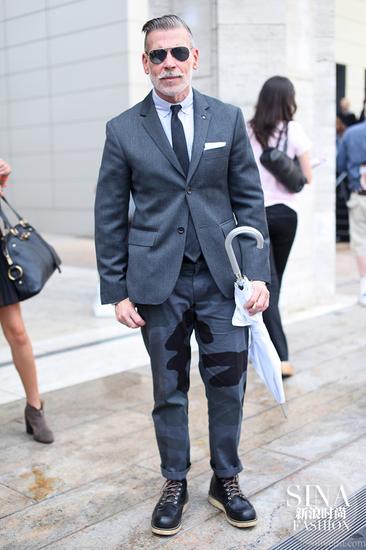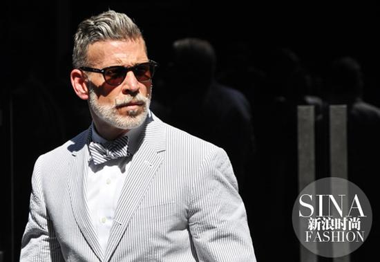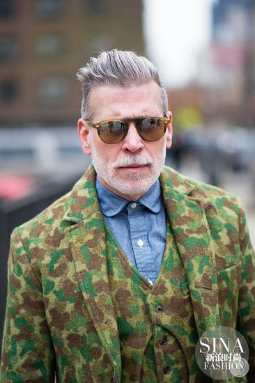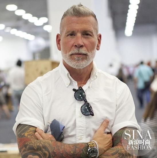 健硕的肌肉、布满刺青的双臂和右侧小腿、经过精心修整而微微翘起的胡子……老型男Nick Wooster让人记住的个人标识确实够多,在他出现的许多辑秀场外型人街拍中,都有报友评价称他为秀场外最会穿衣的“爷爷”,并多次呼吁编编来专门做期他的特辑,其实Nick Wooster才51多岁,会打扮的他也不算特别老相,可能是Nick花白的头发施展“障眼法”,欺骗了大家。