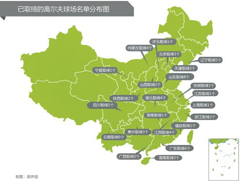 這次被取締的高爾夫球場共涉及23個省份,其中除山東省有8個外,廣東省、云南省各有6個,遼寧省有5個,內蒙古自治區、江西省、湖北省各有4個,北京市、天津市、貴州省、海南省各有3個,山西省、浙江省、陜西省、四川省、廣西壯族自治區各有2個,河北省、上海市、江蘇省、安徽省、福建省、湖南省、寧夏回族自治區各有1個。
