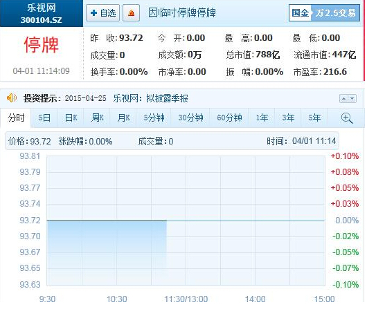 騰訊科技訊(范曉東)4月1日,樂視網今日宣布臨時停牌。深交所早間公告稱,相關媒體報道可能對樂視股票交易價格產生較大影響,經公司申請,樂視網股票于2015年4月1日開市起停牌,待公司通過指定媒體披露澄清公告后復牌。