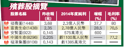 目前本港上市的殯葬股大約有7間,市值較大除福壽園外,還有立足東南亞的富貴生命(1438)。曾經因為概念獨特,有過一輪熱炒。2009年中國生命(8296)上市,開盤4天漲了4倍,一度成為業界神話;2013年福壽園以超購近700倍上市,掛牌首日升幅高達45%;2014年富貴生命挾著亞洲第一大殯葬股來港上市,反而沒有吊起市場胃口。
