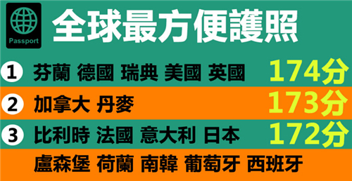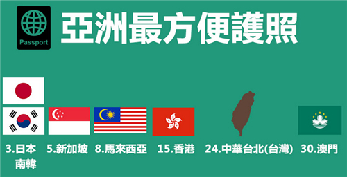 全球顧問公司「Henley and Partners」在根據去年5月數據完成最新調查,以護照免簽證國家或地區作為評分,得出「全球最方便護照」排名,位居前列的都是以歐美國家,亞洲國家或地區較遜色,但都有部分位居前10之列。