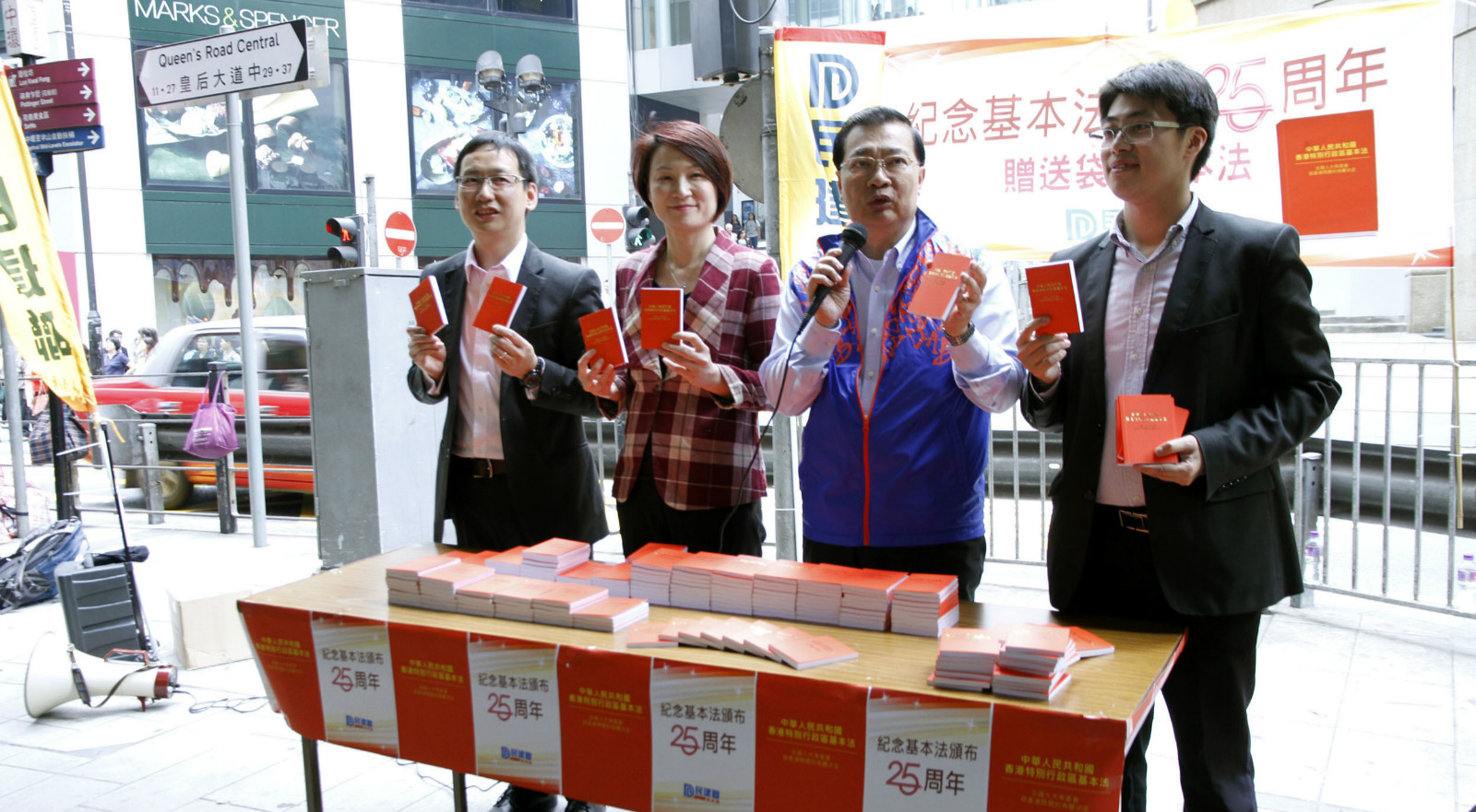 4月2日中午,香港民建联主席谭耀宗(右2)、副主席李慧琼(左2)等在中环街头向市民派发袋装《基本法》,以纪念《基本法》颁布25周年。