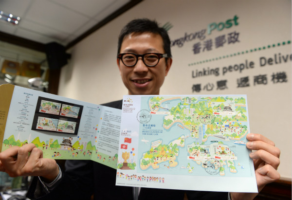 3月31日,在中国香港,一名邮政部门工作人员展示“基本法颁布二十五周年”纪念邮票。