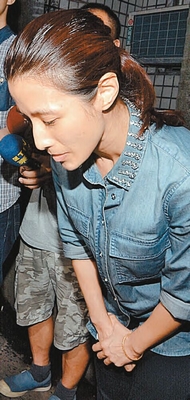 李倩蓉在深夜被請回時神情疲憊,四度鞠躬道歉。中央社