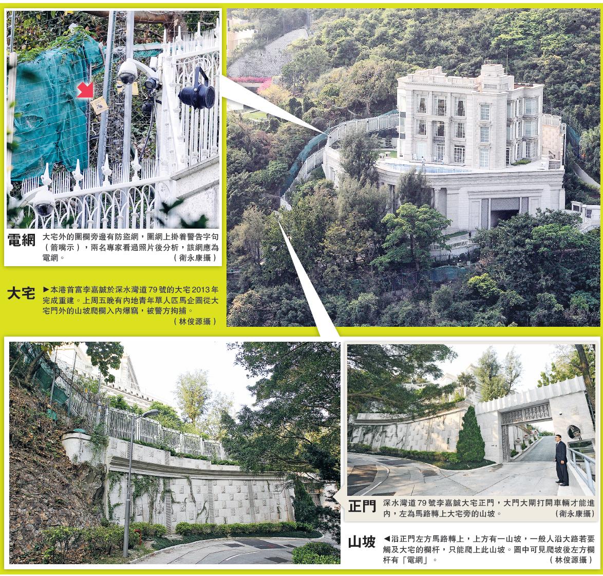 記者昨到案中李嘉誠位於深水灣道的大宅週邊觀察,這幢於2013年初完成重建工程的大宅保安森嚴,一般人如在深水灣道馬路走到大宅週邊的圍欄,需爬上山坡;4層高大宅附近的山坡,亦由圍欄包圍,當中並裝有懷疑是電網的設施。