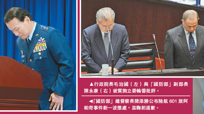 【香港商報网訊】藝人李倩蓉登阿帕奇直升機風波愈演愈烈,臺灣「國防部」昨日公布第二波懲處名單,陸航中校勞乃成帶人進機棚、私帶直升機頭盔出營,共記兩大過調離現職、法辦,年度會依規定將他淘汰。而601旅長簡聰淵少將累計3小過,調離現職,目前共18人遭懲處。臺「國防部長」高廣圻、行政院長毛治國分別為軍官違規行為道歉,馬英九要求「嚴查重罰、絕不寬貸」。