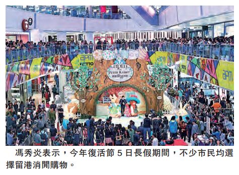 新地代理有限公司租務總經理馮秀炎昨亦表示,今年復活節5日長假期間,不少市民均選擇留港消镕購物,本地零售市道保持穩定。旗下新地12個商場總人流達880萬,同比升約13%,營業額則達1.5億元,升近10%。