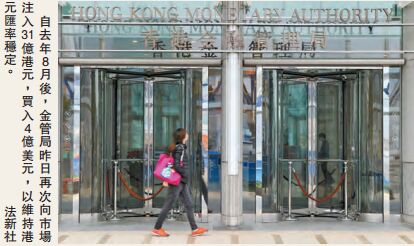 【香港商報網訊】記者黃兆琦報道:本港股市暢旺,市場對港元需求增加,港匯走強。自去年8月后,金管局昨日再次向市場注入31億港元,買入4億美元,以維持港元匯率穩定。
