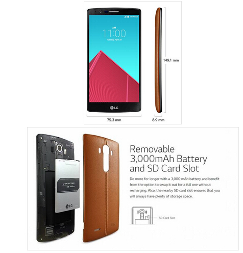 除此之外,LG G4的參數也再一次曝光,機身三圍為149.1×75.3×8.9mm,配備3000毫安時可拆卸電池,同時還支持microSD卡存儲擴展。屏幕參數為5.5英寸2K分辨率,而處理器則為驍龍810。