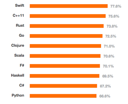 民調結果顯示,蘋果公司推出的Swift語言,以77.6%的覆蓋率,在受歡迎程度上名列第一。超過了其他許多知名度較高的開發語言。