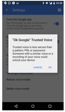 首先,用戶需要在“智能鎖定”選單下點擊Trusted Voice選項,就會收到一個對話框,提示聲音解鎖安全性要弱于其他選項。選擇確定后,用戶就可以喊出“OK Google”來為手機解鎖了。