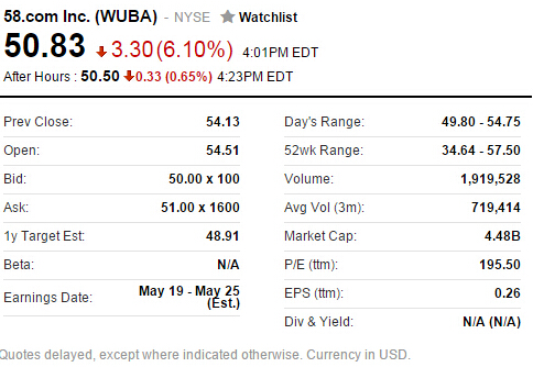 58同城股價北京時間昨夜美股開盤時微走高,盤中下行趨勢明顯,最低時跌至49.8美元,跌幅超7%,最終報收于50.83美元,跌幅為6.1%,市值損失近3億美元,常規交易量約192萬股。