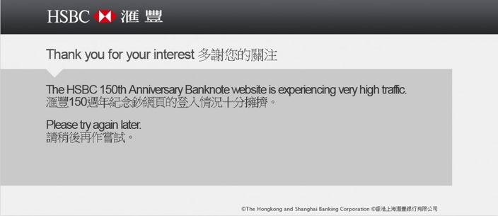 滙豐「開彩」,是繼2012年中銀百年華誕紀念鈔之後,再一次大規模錢幣炒賣話題,醖釀多時至今日凌晨終於揭曉。滙豐凌晨率先在網上系統供認購者查閱結果,不過有關網站午夜後因為擠塞而未能登入,出現「死Link」情況,有人就成功登入,但網站卻未有顯示結果。亦有人遲遲未能登入,乾脆大覺瞓等早上再查閱。