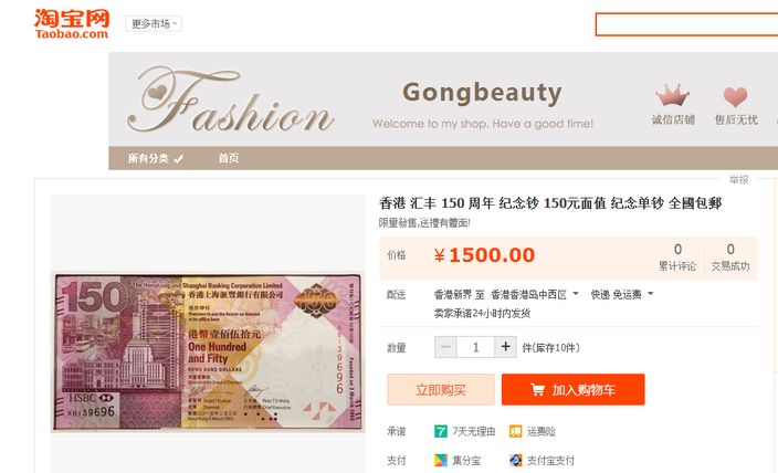 滙豐150周年紀念鈔認購活動今日凌晨終於「開彩」,不過滙豐系統在午夜因為大擠塞而未能登入,出現「死Link」情況。今早系統正常,不少人都中獎,大部分都聲言要「賺返筆」。在淘寶網,有人開價原價$380的單張,炒價高達3倍至1500元人民幣一張,利潤超過290%,相當和味。