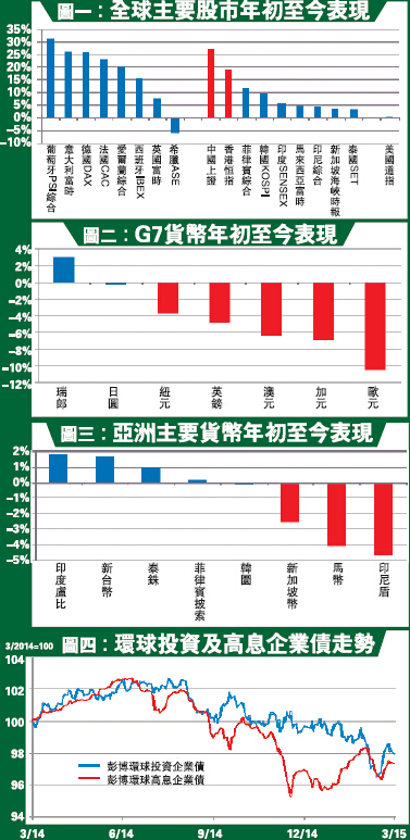 美國炒加息因為經濟好,歐洲放水因為「歐豬」作亂,資金就會由歐洲轉美國?錯了。看看圖一,年初至今,以歐洲頭六大經濟體與「歐豬」、美國及亞洲主要地區計算,論升幅,反而是大炒希臘可能爆煲的歐洲股市最為強勢,其次是亞洲區,最後竟是經濟最好的美國。道指年初至今只升約1%,而同期的歐洲股市就閒閒地升兩成,連A股都只能與之並駕齊驅。大家或奇怪,經濟最差的歐洲竟然排頭位?經濟好反而股市跌?反常啊!