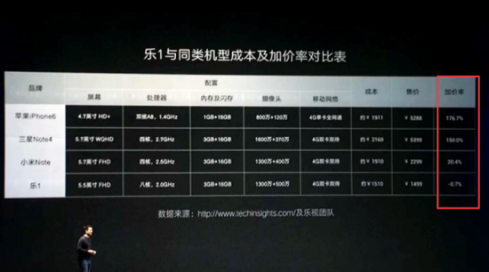 樂1的價格是1499元,比拼的對象就是1799元的魅族MX4,樂1 Pro 2499元,干掉的是3299元的小米Note頂配版。而樂Max則讓用戶根據公開Bom(物料清單,簡單講就是你所有手機的硬件,每一個元器件加起來的成本構成,以及制造費用,加起來就會成為一個Bom單)自主定價。更勁爆的是賈躍亭把其它廠家的Bom成本都給公開了。
