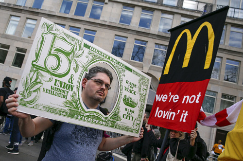 4月15日,在美國紐約,抗議者舉起標語,要求提高快餐店員工時薪。
