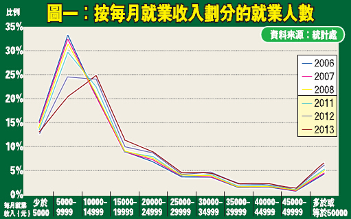 查本港就業人口的職業收入,從圖一可見,比較最低工資生效前后,結構上明顯向好的方向發展(所比較的,是2006年至2008年與2011年至2013年,即是最低工資生效前和最低工資生效后,中間撇除了較受金融海嘯影響的期間,以免數字因經濟波動而受干擾)。可以看到,收入較低的群組,明顯地大幅減少,尤其是月入介乎5000至1萬元的,占比由此前超過30%,短短兩年間急降至近20%(月入少於5000元的,多數從事半職工作,故此數字較易受工時而非工資所影響);比較而言,沒有最低工資之前,有關占比雖然有所下降,不過降幅絕對不可相提并論。
