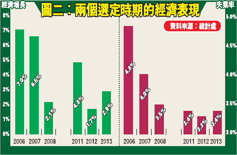 圖二所示,就是兩段時間的經濟增長和失業率數據。的確,2006年至2008年間,本港GDP年均增長約達5%,比較2011年至2013年的3%左右還要高,可是整體來說,前一時期的戶員卻無法有效分享有關成果,由低收入的到高收入的,其收入增長反過來都不及后一時期,顯示最低工資的確有助戶員爭取更佳回報。不過,當加入失業率這個因素考慮后,2006年的失業率達4.8%,2007年降至4%,2008年進一步跌到3.5%,這很大程度解釋了期內工資增長較慢的問題,因為在過多勞動力需要消化的情況下,工資上調的誘因并不太大;相反,2011年至2013年間,本港的失業率都徘徊於3.3%的低水平,即近全民就業的水平,這意味勞動供應非常緊張,工資本來就存在上調壓力,最低工資某程度可能是「生逢其時」罷了。最低工資生效后的加薪潮流,可能只跟最低工資本身存在「巧合」而非「因果」的關系——雖則,其對低收入人士及收窄貧富差距的作用還是不能抹殺的。