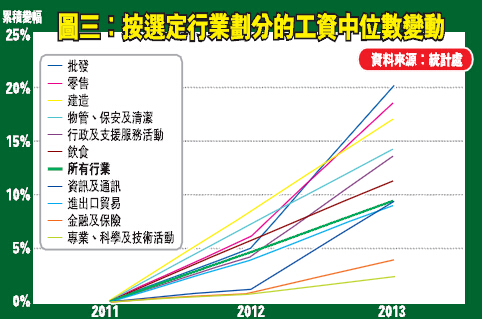 查不同行業的每小時工資中位數變化,就反映了勞動力供求關系的重要性。首先,受惠最低工資,每小時工資中位數本來較低的行業,包括每小時只有30元左右的物管、保安及清潔,2011年至2013年間的累積薪酬增幅,便高逾14%,明顯高於全港平均的9.5%。然而,不但受惠最低工資,同時還受惠旅游業的行業,尤其是零售、批發,期間的薪酬增幅就高約20%。相對而言,本來工資較高的行業,例如金融、專業、科學及技術等,則無疑遠遠跑輸大市,只錄得2%至4%的增長。也就是說,這個時期,似乎販賣勞力比販賣知識更加劃算,與一般的常識理解大相逕庭。