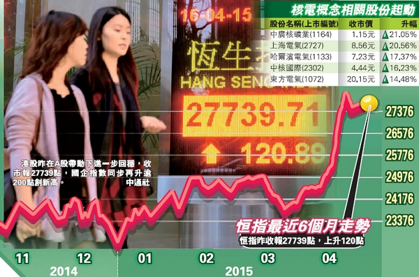 在內地首季GDP數據公布后,恒指昨天初段表現平靜,低開61點,而內地股市於昨日回吐后亦見反彈,同時帶動恒指反覆靠穩。全日恒生指數於27500至27800之間上落,最終升120點,主板全日成交1985.9億元,持續數日后首度不過2000億元。國指則報升248點,報14720。內地股市方面,此前新股申購及經濟數據疲弱的負面因素逐步消化,昨日再展升勢。滬深股市昨早低開后大幅走高,核電核能概念13股漲停,石油、保險及銀行等權重股亦上漲,滬綜指全日收升2.7%,報4194點,逼近4200點,再創逾7年高,創業板指數升1.74%,帶動深綜指升1.17%。