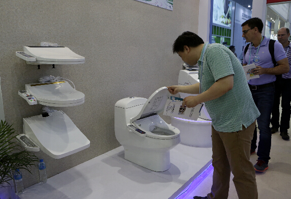 在廣交會衛浴展區,記者發現,智能馬桶蓋已成為多家中國衛浴廠商的主打產品,大多具有坐蓋加溫、女性專用、臀部清洗、烘乾,防潮等功能,吸引了大批采購商駐足洽談。