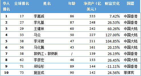 居2015華人富豪榜首位的是香港富豪李嘉誠,淨資產高達333億美元;香港富豪李兆基以248億美元的淨資產居第二名,萬達董事長王健林以242億美元的淨資產額位居第三。