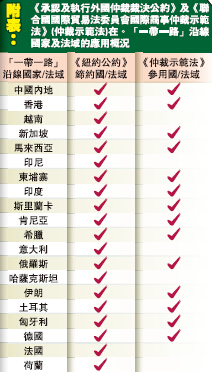 現時,香港是亞洲的主要國際商事仲裁中心之一。在提供國際商事仲裁服務方面擁有多項優勢,包括擁有:(一)豐富的經驗、(二)優秀的本地及海外人才庫、(三)達國際水平的相關專業服務及(四)與國際接軌的仲裁法例(註附表)。雖然這些優勢有助香港在爭取國際商事仲裁案件方面取得先機,但是卻不足以令香港成為國際商事仲裁中心。因為香港仲裁業界現時的能力並不足以應付「一帶一路」將會帶來的龐大服務需求。有見及此,香港政府應該盡早與業界合作,投放資源以強化香港仲裁業界的能力。