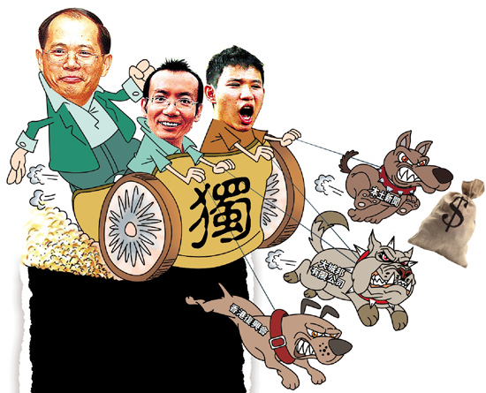 陳雲(左)授意入室弟子馬駿朗(右)成立“香港獨立黨”,再與親信曾焯文(中)設立的“大城邦有限公司”收取外界捐款,共同推進“港獨”/設計圖片