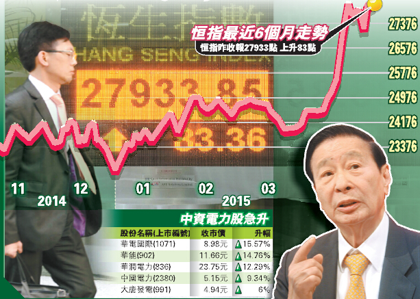 發改委將加快資源能源價格市場化,電力股全線炒上,華潤電力(836)升12.3%,為最大升幅藍籌。華能(902)、華電(1071)及中國電力(2380)分別升14.8%、15.6%及9.3%。