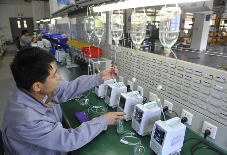 位於三河市燕郊國家高新技術產業開發區內的一家醫療設備制造企業員工在車間內檢測輸液泵(4月22日攝)。