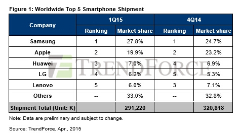 騰訊數碼訊(編譯:ExyPnos)根據國外媒體的報道,TrendForce近日發布了對全球智能手機市場的最新統計,該統計顯示2015年第一季度全球智能手機出貨量為2.912億臺,與上季度相比下降了9.2%。TrendForce表示出貨量的下降主要是由于中國和印度等新興手機市場對手機需求的放緩。此外,TrendForce認為雖然智能手機在中國的銷量未來將會回升,不過第一季度全球智能手機出貨量的下降仍然反映了中國經濟增速的放緩、運營商對購機補貼的減少、iPhone在第一季度成功以及歐元的貶值。
