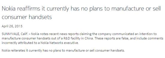諾基亞在官方網站上發布消息稱,諾基亞“重申,目前沒有計劃制造或銷售消費類手機”。“這些報道是錯誤的,引述的言論被錯誤地認為來自諾基亞的高管。”