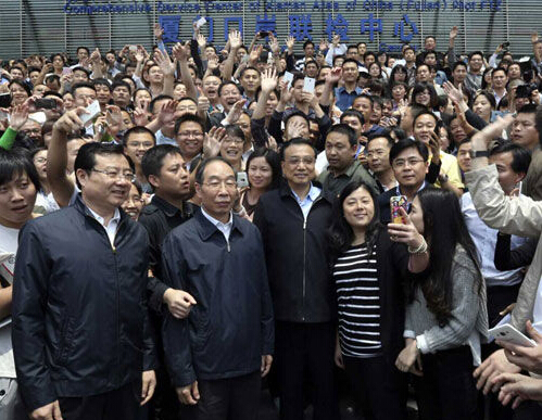 同樣的表述在此次福建考察得到重申,而被稱為“改革高地”的自貿區被寄予厚望。4月22日,李克強剛下飛機就來到中國(福建)自貿試驗區廈門片區象嶼綜合服務大廳。他肯定當地精簡審批流程、再造政府職能的探索,并對他們將工商、稅務、質檢的“三證三號”合并為“一照一號”的改革探索表現出高度興趣。