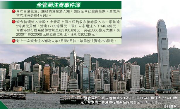同時,資金持續流入本港,金管局上周末在紐約收市后時段入市,承接逾2億美元買盤,沽出17.05億港元,單日向市場注入了148.8億元,本周二香港銀行體系結餘增加至約3106.8億元,突破3000億元大關,與2009年時3200億元歷史高位相比,僅相差不足93.2億元。