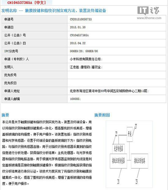 該專利的申請號為2015100507538,申請公布號為CN104537365A,發明人為江忠勝、唐恒鈞、潘雙全,申請人信息則顯示為“小米科技有限責任公司”。很顯然,這就是小米手機、平板等產品未來將要搭載的指紋識別技術。