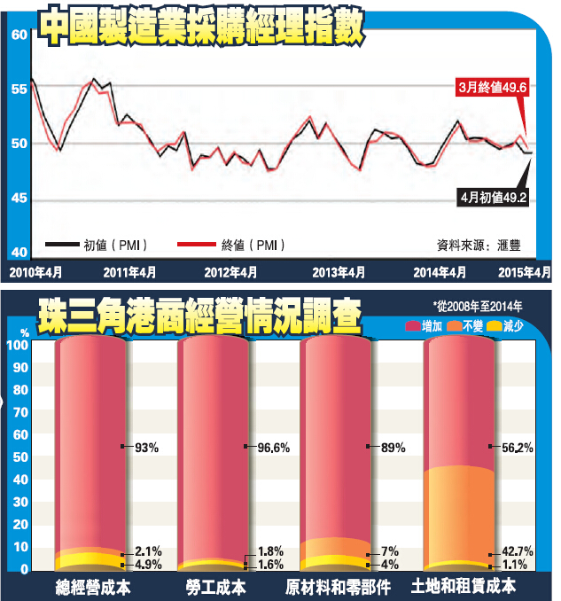 根據豐最新數據,中國製造業採購經理人指數(PMI)3月份終值為49.6,而4月份初值低至49.2,創12個月以來新低。具體至珠三角地區,工總於今年2月發布的珠三角製造業港商研究報告顯示,珠三角香港製造企業的現狀呈兩極態勢,在較發達城市投資的港商更具轉型升級動力乃至擴張業務至其他內陸省市,而較遲(2009年後)在東莞等地設廠的企業則對轉型感到力不從心,很多中小型企業存在資金缺乏的問題,依舊保持一貫經營策略的企業佔四成。