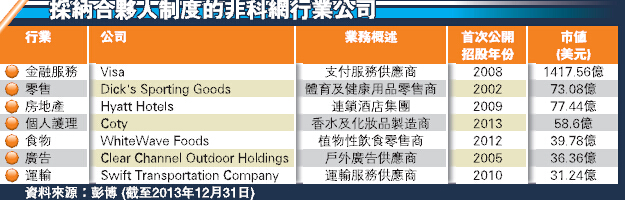此外,雖然不同投票權架構常見在創新企業,特別在資訊行業,但不少從事能源、金融及通訊行業的公司,均採納合夥人制度。據《彭博》統計,在2001年至2013年12月底期間,美國涉及多重股權架構的首次公開招股中,多達80%屬非資訊科技行業,當中包括提供支付服務供應的 Visa、環球知名酒店集團 Hyatt Hotels、以及化妝品製造商 Coty (詳見附表),反映合夥人制度已被不同行業的公司廣泛採納,故香港要為合夥人制度設定行業限制,或會予人「開倒車」的感覺,並降低吸納資金來港上市的能力。