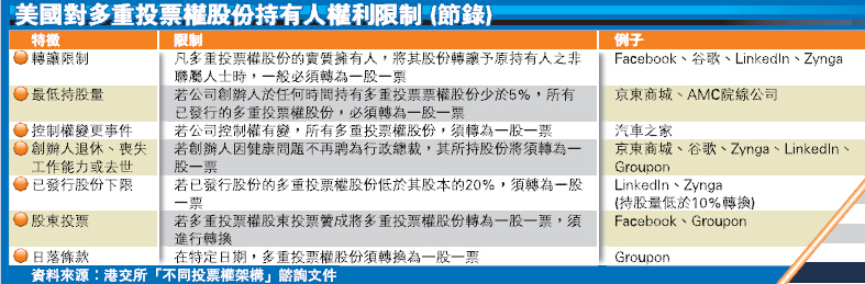 除劉強東以外,不少科網巨人亦被上市條款制約其多重投票權的權力。Facebook 創辦人朱克伯格(Mark Zuckerberg) 雖貴為創辦人、創始股東兼公司主席,惟一旦其他多重投票股東大比數贊成將多重投票股份轉為一股一票,朱克伯格手上的多重投票股份亦須轉為一股一票,不再享有特別投票權。