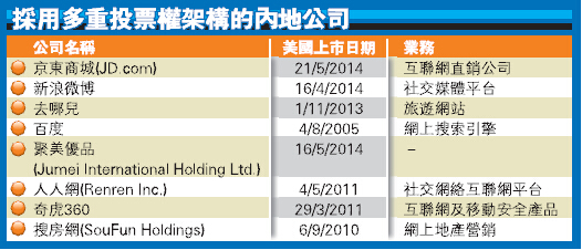 事實上,不計及阿里因香港不願採納合夥人制度,而須轉往美國上市外,在過去10年,百度、京東商城、搜房網等內地的科網股,亦已因種種原因,包括取得較高估值以及美國市場的較高知名度,早已轉往美國市場掛牌(詳見附表);一旦香港日後為合夥人制度放行,或會提供誘因,讓該等科網公司利用香港「近水樓臺」的優勢,在香港作第二上市。