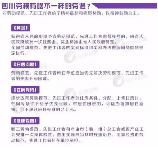 四川省對于省級勞模有一次性獎金、解決夫妻分居問題、住房優待、健康查體、療養休養、生活補貼、優先錄用等待遇。