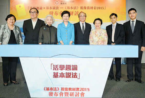 教育局昨午為教材套舉行發布會暨研討會,政務司司長兼基本法推廣督導委員會主席林鄭月娥擔任主禮嘉賓,其他出席者包括教育局局長吳克儉、全國人民代表大會常務委員會香港特別行政區基本法委員會副主任梁愛詩和委員譚惠珠、全國人大常委會香港特別行政區基本法委員會委員及香港大學法律學院陳弘毅教授等。